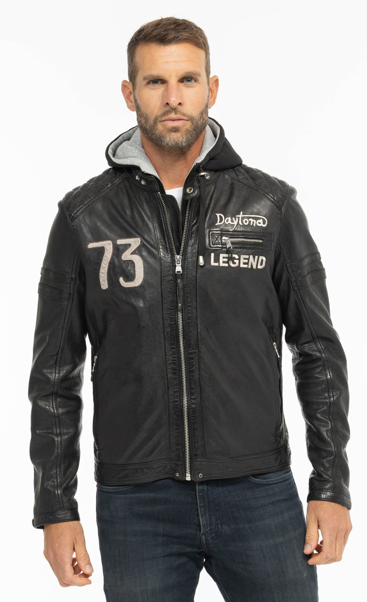 Schwarze Herren-Lederjacke mit Kapuze im Daytona-Motorradstil