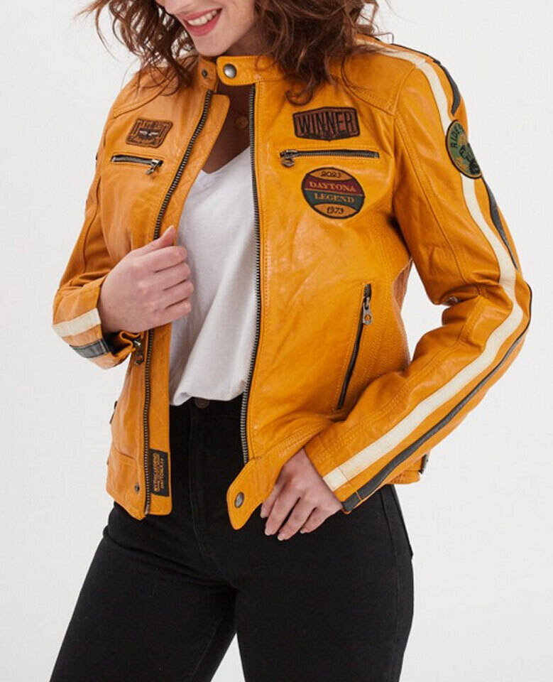 Wie man dieser prächtigen Lammlederjacke fur Frauen widersteht. Wirklich trendig, originell, aufgrund seines Biker -Geistes, seinen Farbspielen, seinen Abzeichen und seinen Panels. Aber wir behalten eine städtischere Seite, weil das Leder flexibel, komfortabel, ohne Muschel ist und sich an den Korper eingestellt hat, um mehr Weiblichkeit zu erhalten. In der Tat ist es ein Leder in Lamm, flexibel, dunn genug, ideal fur die Mitte der Saison. Daruber hinaus ist die Auskleidung auch in Baumwoll und Polyester ziemlich leicht, bequem, mit zwei Innentaschen, die fur Ihre personlichen Effekte praktisch sind. Wir mogen es, seine vielen Details, die ihm Originalität, Moderne usw. mit seinen Abzeichen, seinen Lederbändern auf den Hulsen bringen. Die Lederjacke schließt mit einem Reißverschluss, hat Taschen in Brust und zwei Verzerrungstaschen. Sie haben eine Leichtigkeit am Boden der Runden, schoner, die Jacke eignet sich gut fur den Korper und energetischer'