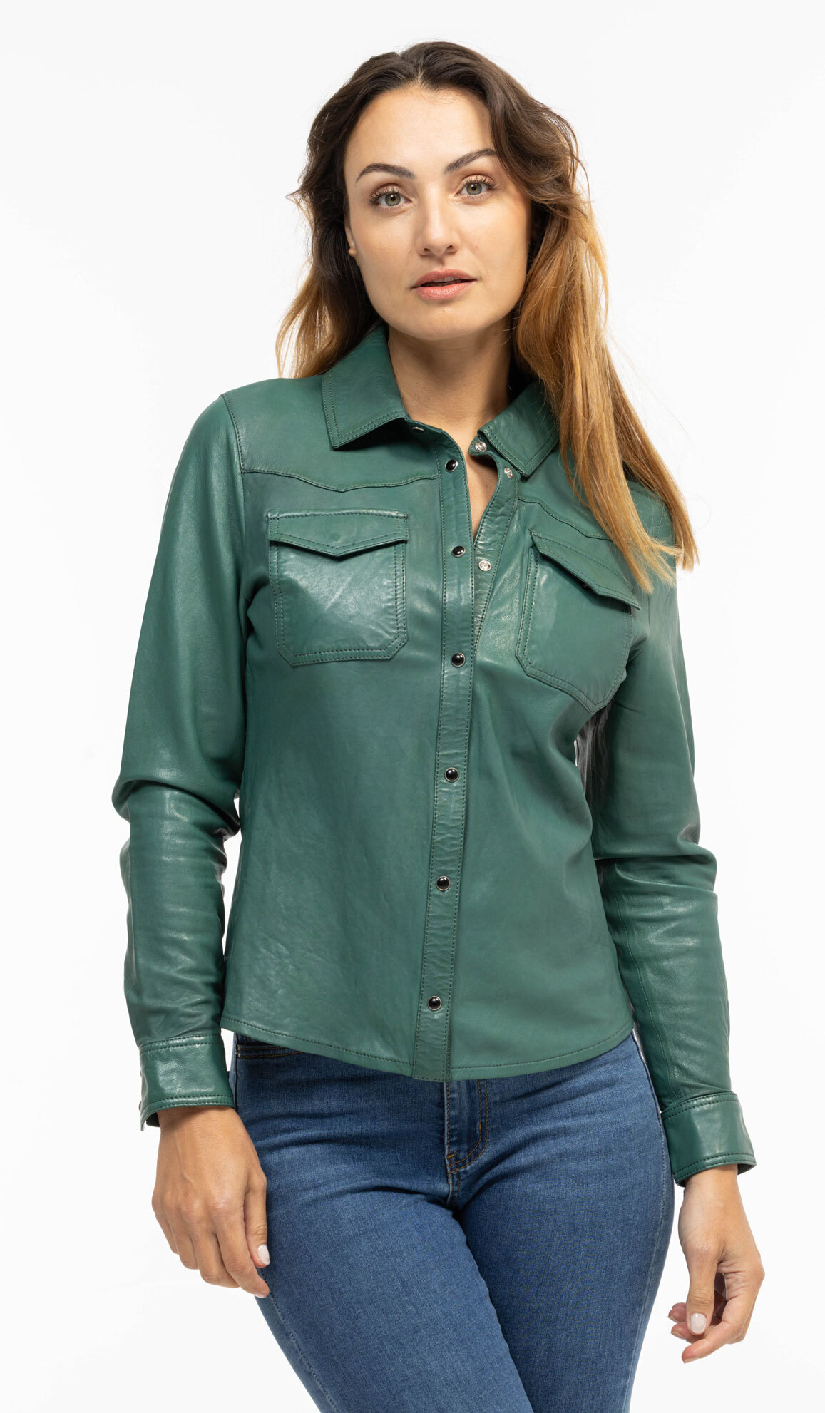 Lammlederhemd fur Damen in gruner Farbe der Marke Rose Garden.  Das taillierte, traditionell geschnittene Hemd passt genauso gut zu Jeans oder einem eher klassischen Outfit. Es wird mit Druckknopfen geschlossen, hat einen Hemdkragen und verfugt uber 2 aufgesetzte Taschen mit Patte auf Brusthohe sowie einen Manschettenabschluss mit Druckknopfen unten an den Ärmeln. Das Hemd ist nicht gefuttert.