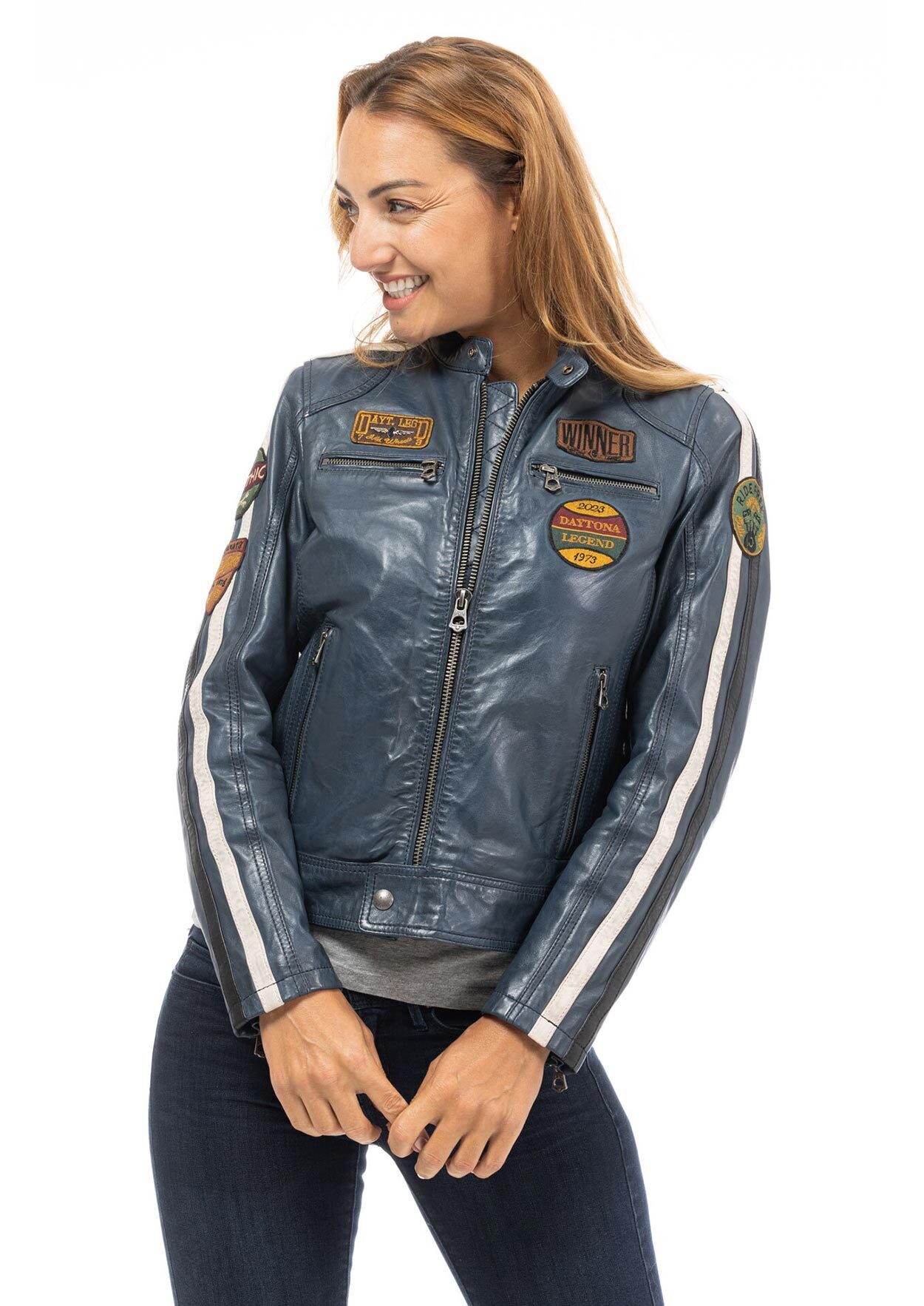Wie konnen Sie dieser herrlichen Lammlederjacke fur Damen widerstehen? Wirklich trendig und originell, dank seines Schnitts im Biker-Stil, seines Farbspiels, seiner Abzeichen, Einsätze usw. Wir finden einen Schnitt im Biker-Stil mit seinem kleinen Stehkragen und seinen farbigen Lederstreifen. Aber wir behalten einen urbaneren Look bei, denn das Leder ist geschmeidig, bequem, ohne Schale und passt sich dem Korper an, was fur mehr Weiblichkeit sorgt. Tatsächlich handelt es sich um Lammleder, geschmeidig, recht fein, ideal fur die Zwischensaison. Daruber hinaus bleibt das Futter recht leicht, aus Baumwolle und Polyester, bequem, mit zwei Innentaschen, praktisch fur Ihre personlichen Gegenstände. Uns gefallen die vielen Details, die ihm Originalität, Modernität usw. verleihen, wie die Aufnäher und die Lederbänder oben an den Ärmeln. Die Lederjacke wird mit einem Reißverschluss geschlossen, hat Brusttaschen mit Reißverschluss und zwei schräge Taschen. Sie haben bequeme Reißverschlusse an der Unterseite der Ärmel, schoner, die Jacke schmiegt sich gut an den Korper an und spendet mehr Energie.