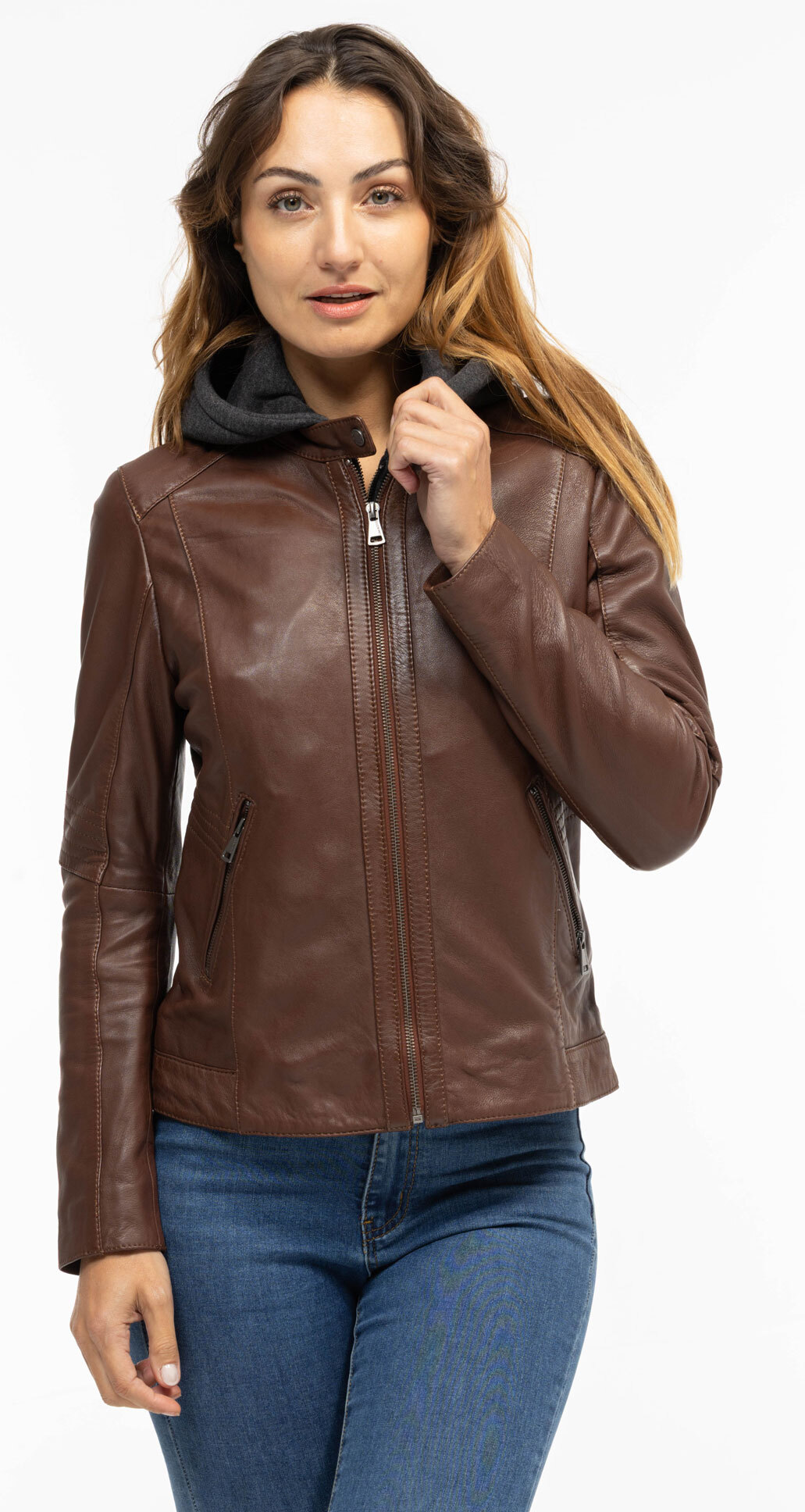 Damen-Lederjacke mit Kapuze in Cognac-Eichenholz