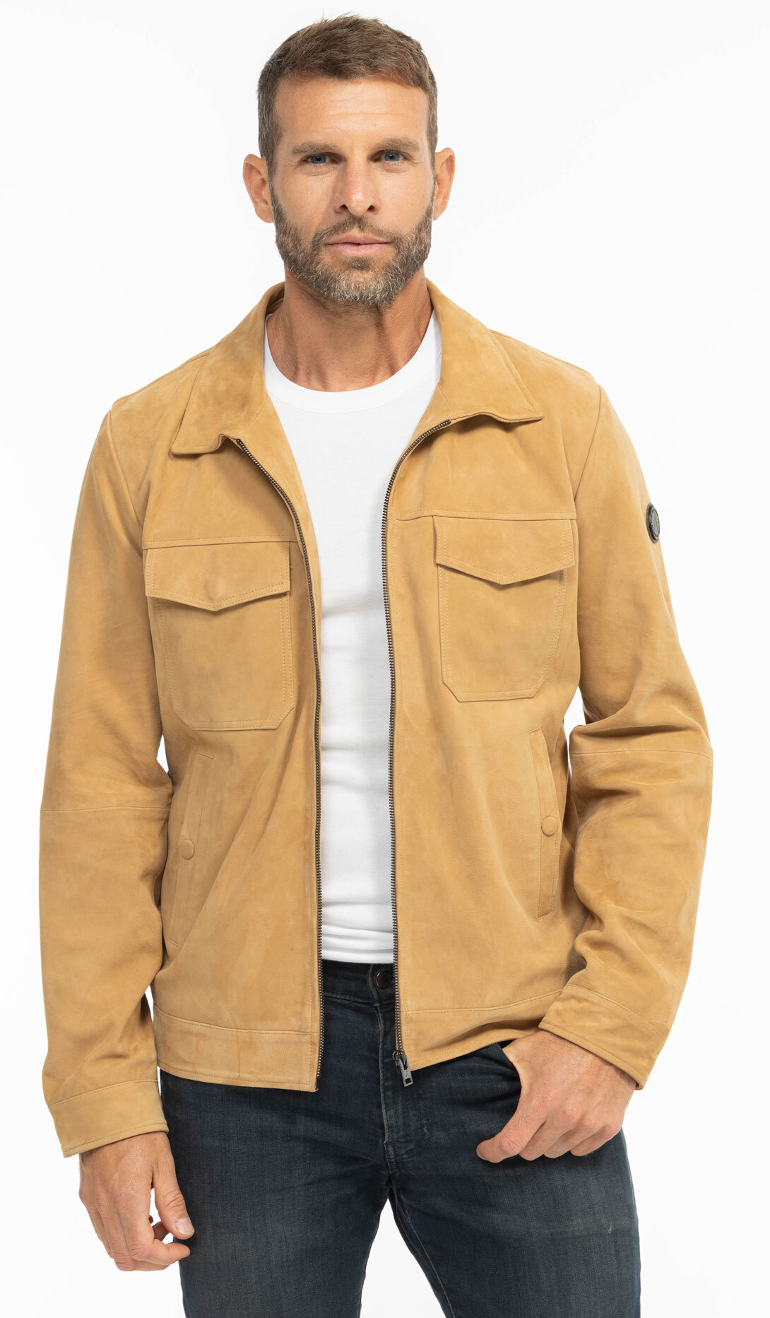 Beige Ziegenwildlederjacke fur Herren. Wir finden einen regulären Schnitt mit einem schicken und vielseitigen, lässigen Look, ideal fur den Fruhling, da er ein leichtes Futter aus Haut (Ruckseite) und Polyester fur den Rest mit 2 Innentaschen (eine mit Verschluss und die andere mit 1 Knopf) hat. Die Jacke verfugt uber einen Hemdkragen, 2 Brusttaschen mit Patte und 2 Druckknopftaschen an der Taille. Am Arm finden Sie ein dekoratives Abzeichen und unten an den Ärmeln einen Manschettenabschluss mit Druck. Die Jacke wird mit einem zentralen Reißverschluss geschlossen. Rechnen Sie bei einer Große M mit einer Korperlänge von 68 cm.