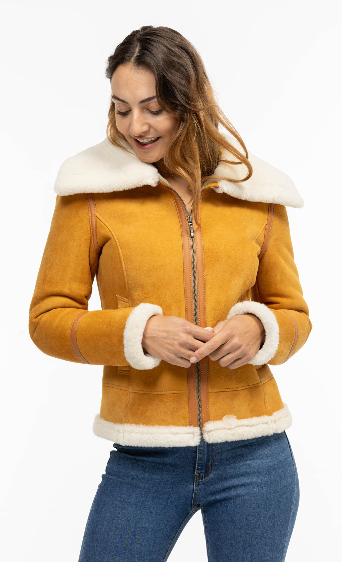 Kurze Schaffelljacke fur Damen in der Farbe Cognac. Wir finden einen regulären Schnitt im eher schicken und lässigen Bomber-Stil. Modern und zeitlos wird es Sie im Winter zufriedenstellen und schutzen. Die ideale Schaffelljacke fur den Winter besteht aus Lammfell, das heißt, Sie haben außen das Schaffell und innen die Wolle. An der Taille finden Sie einen Hemdkragen aus Schaffell und zwei Taschen. An der Unterseite der Ärmel befindet sich ein Umschlag aus Schaffell, das Sie umschlagen konnen. Bei der Lammfelljacke gibt es keine Innentaschen und Sie mussen bei Große 38 mit einer Korperlänge von 60 cm rechnen (Kragenansatz bis zum Saum).
