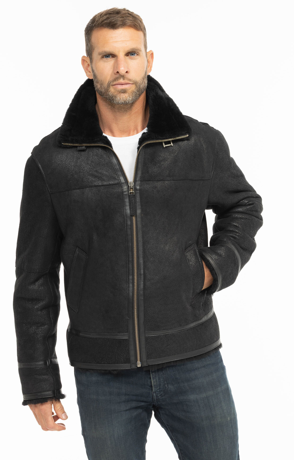 Herren-Lammfelljacke von Cuirs Guignard. Bomberjacken-Stil, hergestellt aus Lammfell, also Schaffell, gefuttert mit eigenem Fell. Uns gefällt ihr gerader, klassischer und zeitloser Schnitt, sie ist die Jacke, die Sie in Ihrer Garderobe haben sollten, außerdem ist sie aufgrund ihres Schnitts ideal fur alle Korpertypen. Ideal fur den Winter, es ist mit seinem Schaffell sehr warm und bleibt dabei angenehm, das Leder bleibt recht geschmeidig. Sie haben einen geraden Kragen, der direkt unter einer Lasche mit Druck versteckt ist. Die Schaffell-Bomberjacke wird mit einem Reißverschluss geschlossen, was praktisch ist und kein Wind eindringen kann. Sie werden das äußere Erscheinungsbild des leicht gealterten Leders mogen, das dieser Jacke viel Charakter verleiht. Es gibt schräge Taschen, in denen Sie Ihre personlichen Gegenstände sicher verstauen konnen, und praktisch, um Ihre Hände bei sehr kaltem Wetter zu verstecken. Am unteren Ende der Ärmel befindet sich ein Bundchen aus Schaffell, Sie konnen es aber auch gerade tragen, wenn Ihnen das Bundchen nicht gefällt. Die Bomberjacke hat eine Korperlänge von 66 cm bei Große L, vom Kragenansatz bis zur Unterseite des Kleidungsstucks.