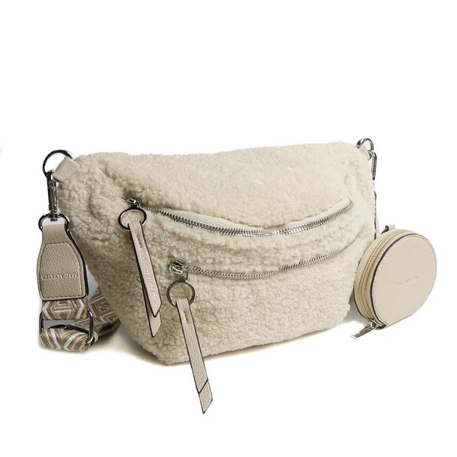 synthetische Bananentasche fur beige Frau mit ihrer runden Brieftasche. Es gibt eine klassische Form mit 3 Taschen an der Außenseite (gegenuber 1 Klappe + 1 auf der Vorderseite und 1 Rucken mit 1 Reißverschluss) und einem trendigen Stil. Die Tasche schließt einen leichten Verschluss und offnet sich in einem einzelnen Fach, der durch 1 Tasche mit Verschluss getrennt ist, die Auskleidung synthetisch und die Beutelmessungen wie folgt: