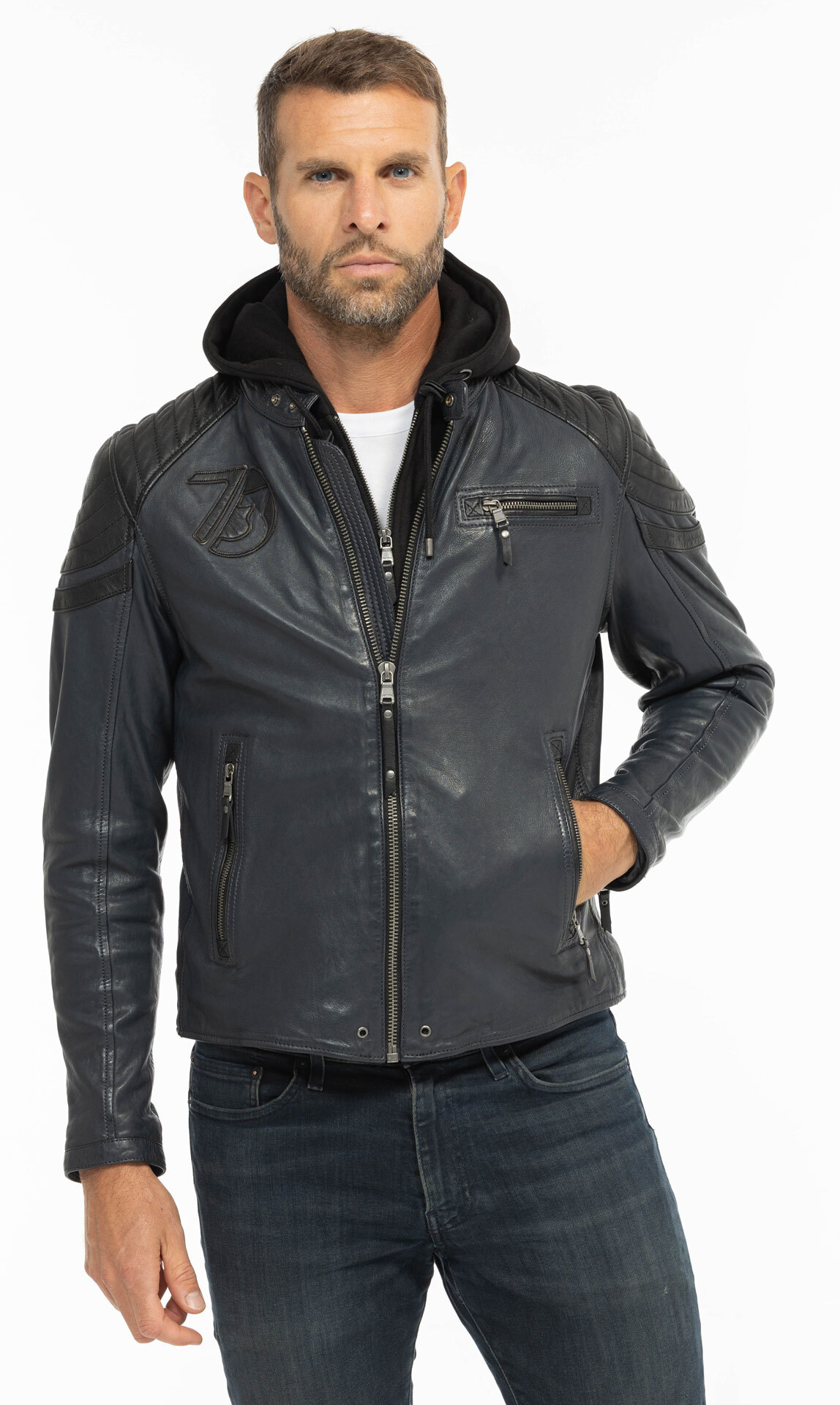 Herren-Lederjacke mit blauer Kapuze im Daytona-Motorradstil