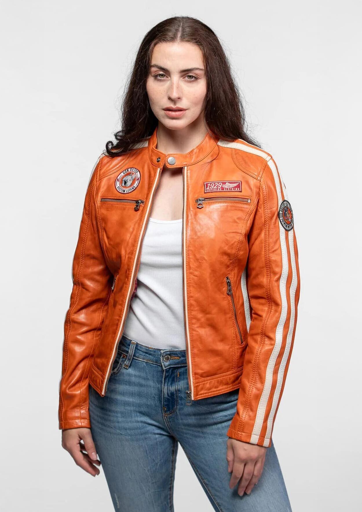 Sehr hubsche Damenjacke der Marke Rose Garden im angesagten Biker-Look. Es besteht zu 100 % aus pflanzlich gegerbtem Lammleder. Betonen Sie Ihren Stil mit dieser Von Dutch-Lederjacke, inspiriert von den schonsten Stunden des amerikanischen Oldtimer-Rennsports. Zwischen Authentizität, Charakter und modernem Schnitt verkorpert es die rebellische und zeitlose DNA der Marke. Um hervorzustechen und origineller zu wirken, ist die Lederjacke mit gestickten Aufnähern im Vintage-Motorradstil an den Armen und der Brust versehen. Daruber hinaus sind an den Armen dekorative Seitenbänder aufgenäht. Sie haben einen Stehkragen mit Druckknopf, der Verschluss erfolgt mit einem geraden Reißverschluss, die Ruckseite der Ärmel ist mit Reißverschlussen versehen. Auf der Vorderseite befinden sich vier Außentaschen mit Reißverschluss, zwei auf der Brust und zwei an der Seite. Der Korper ist komplett mit cremefarbener Baumwolle gefuttert und die Ärmel sind aus Polyester. Dieses Modell wird in einem taillierten Schnitt angeboten, um Ihre Silhouette zu verfeinern.