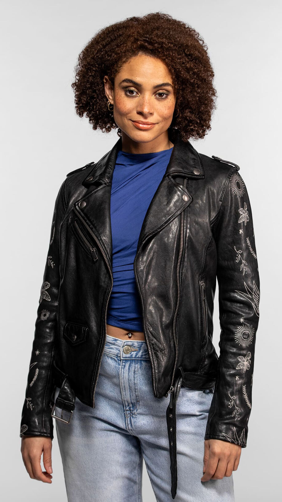 Schwarze Damen-Lederjacke im Biker-Stil Rosengarten