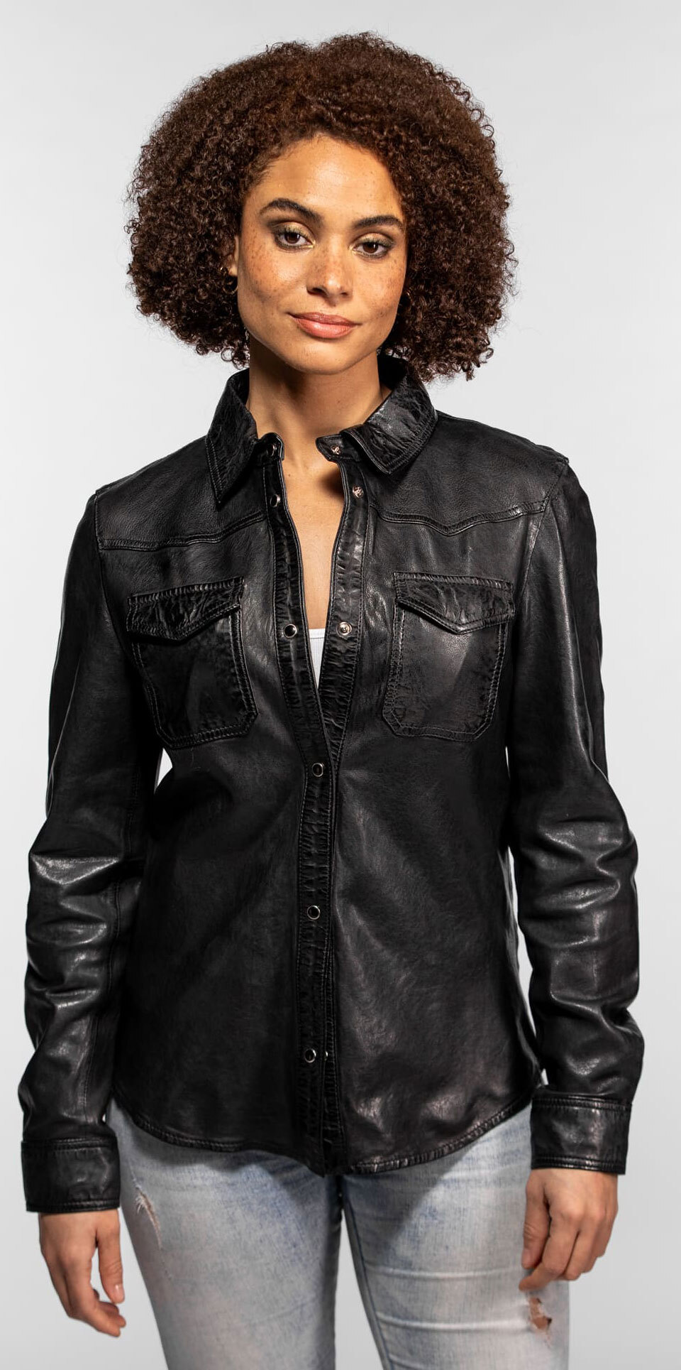 Mit diesem schwarzen Damen-Lederhemd entsteht ein Hybridstuck mit mehreren Facetten. Unser Fachwissen als Kurator fuhrte uns zu diesem Modell aufgrund der außergewohnlichen Qualität des Lammfleischs von seltener Finesse. Fur einen sinnlichen Look kann es direkt auf der Haut oder als offenes Overshirt fur einen betont rockigen Look getragen werden. Es ist kein einfaches Kleidungsstuck, sondern ein charaktervolles Stuck, das sich Ihrem Leben anpasst, vom Buro bis zu gewagteren Abenden.