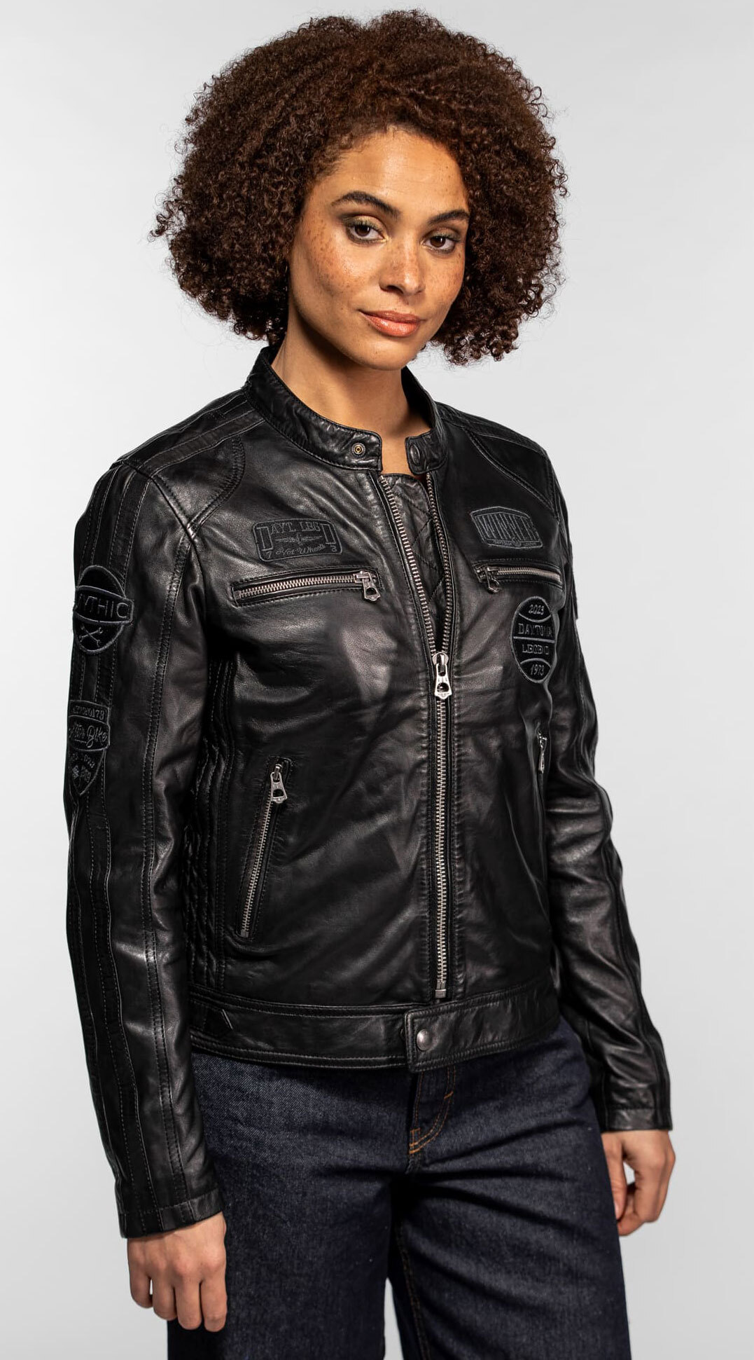 Schwarze Damen-Lederjacke im Motorrad-Stil, Rosengarten
